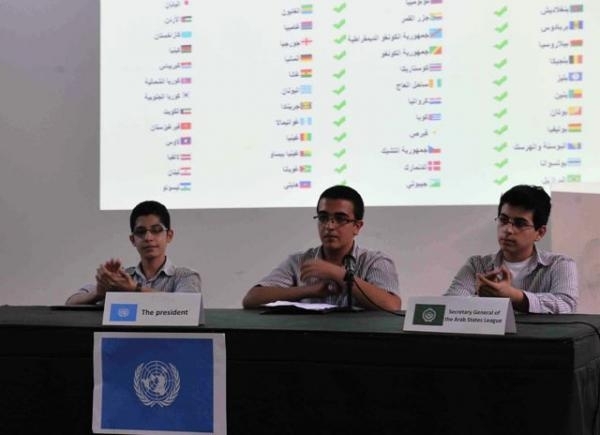 فعلى مدى اكثر من ساعة ونصف الساعة ، تحول مدرج احدى قاعات المحاضرات في المعهد الجامعي للتكنولوجيا الى مجسم مصغر للجمعية العامة للأمم المتحدة، حيث اتخذ أكثر من مائة تلميذ وتلميذة من البهاء اماكنهم في مقاعد اعضاء الهيئة العامة وامام كل منهم علم بلاده ، فتقدم مندوب قطر التي ترأست الجلسة الأعضاء الحاضرين ، وكان لافتا عدم تخصيص مقعد لإسرائيل تأكيدا على حق الشعب الفلسطيني في دولته ، وحضر مندوب لبنان ومندوبة فلسطين ومندوبي الدول الكبرى .