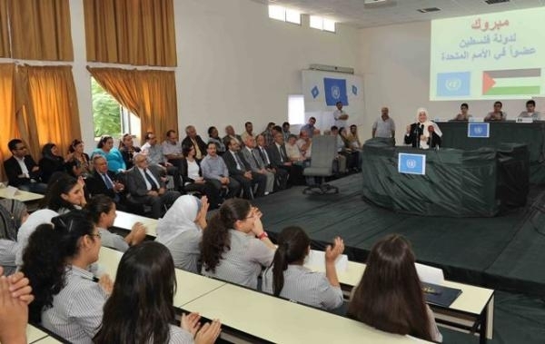واضاف: تقدمنا بطلب عضوية فلسطين الى الامم المتحدة وهناك عقبات ، الاجراء حتى الآن يسير بشكل طبيعي ، يقدم الطلب للأمين العام للامم المتحدة وبدوره يرفعه الى رئيس مجلس الامن ، رئيس مجلس الامن يشكل لجنة من الاعضاء الـ15 في مجلس الامن ليدرسوا الطلب من الناحية القانونية والاجرائية واذا توافقوا واذا كان هناك 9 اعضاء من الـ 15 يؤيدون هذا الطلب ولم تستخدم اي دولة من الدول الخمسة الدائمة العضوية حق النقض لرفض الطلب، عندها يذهب بتوصية ايجابية الى الجمعية العامة التي تصوت عليه بثلثي الحاضرين والثلثين .. اذا لم تات التوصية الايجابية عندها ينتظر الى ان تتولد عناصر جديدة ، يطلب الامين العام للامم المتحدة من مجلس الامن ان يعيد النظر في الطلب هناك دول مثلا الصين بقيت 22 سنة حتى قبلت عضويتها في الامم المتحدة كاملة ... لذلك امكانية الرفض هذه ليست نهاية المطاف واهم شيء ان هذا الطلب هو محطة من محطات النضال ، نريد بنشاطكم هذا وفي التفاعل ان تبقى هذه القضية حية تضغط على الضمير العالمي الى ان نصل الى الحق وتكون فلسطين دولة حرة سيدة مستقلة وعاصمتها القدس .