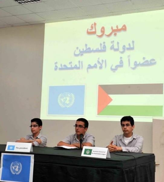 بداية كانت كلمة ترحيب من المعلمة رامية السوسي ، وادار مندوب قطر ( التلميذ محمد المصري ) الجلسة، ومن على منصة شبيهة بمنصة الأمانة العامة وفي خلفيتها شعارها الأممي ، أطل الأمين العام بان كي مون " التلميذ مصطفى السكافي " الذي اعتبر أن الفلسطينيين يستحقون بأن تكون لديهم دولة لذا نتعهد بذل جهود من دون هوادة للمساعدة في ارساء السلام بفضل اتفاق يتم عبر التفاوض ".