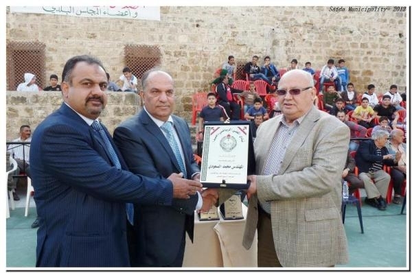 وبعد فقرة فنية فولكلورية قدمتها فرقة القدس الفلسطينية، ومعزوفات للفرقة الموسيقية في كشافة الجراح، قدم المهندس الدنب والبطل أرقدان درع نادي المعني المذهب إلى رئيس بلدية صيدا المهندس محمد السعودي عربون وفاء وتقدير.
