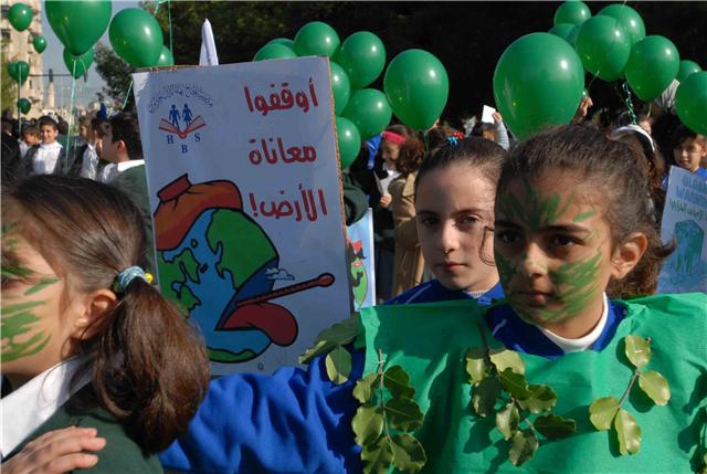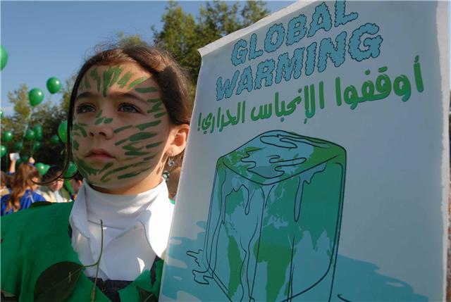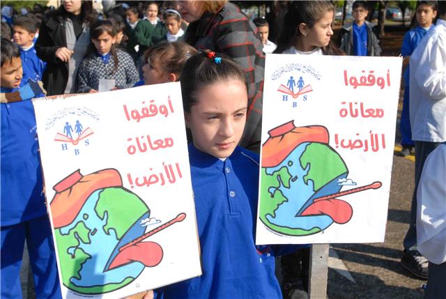أوقفوا معاناة الأرض .. أوقفوا الاحتباس الحراري .. صرخة أطلقها تلامذة مدينة صيدا الى المؤتمر المناخي الذي تستضيفه العاصمة الدانماركية كوبنهاغن من أجل العمل على الحد من ارتفاع حرارة الأرض وعوامل التصحر والتلوث والإنحباس الحراري التي تساهم في تفاقم هذه المشكلة .