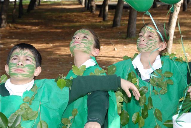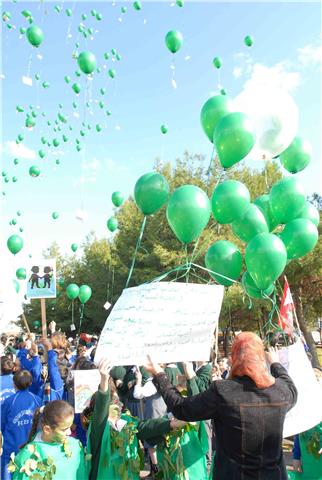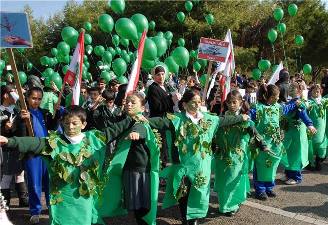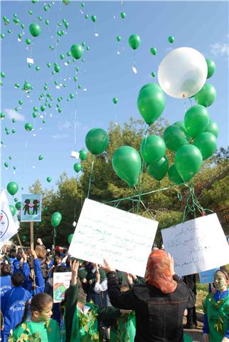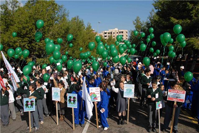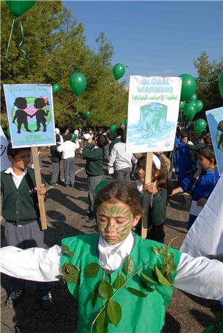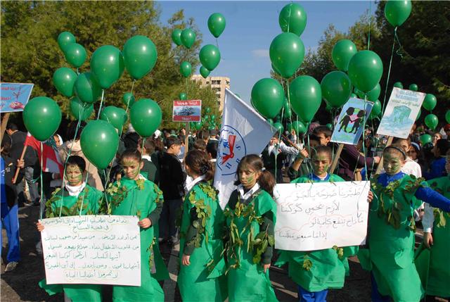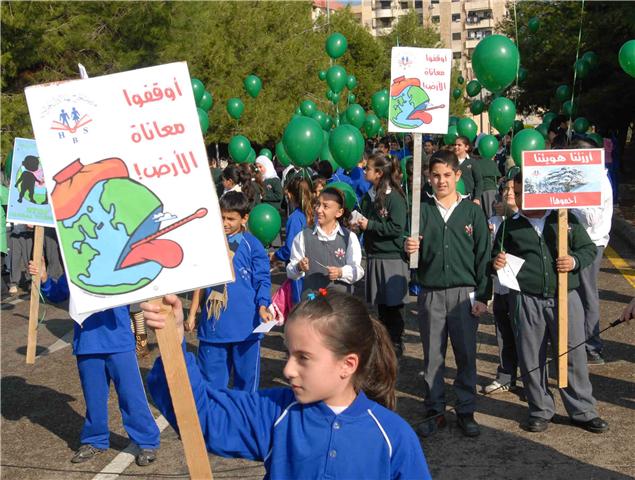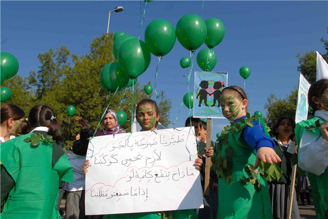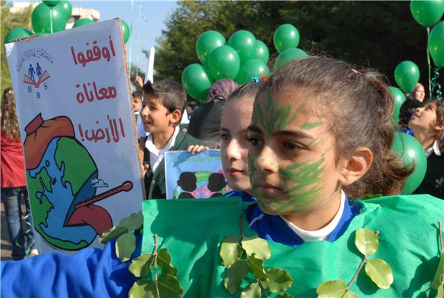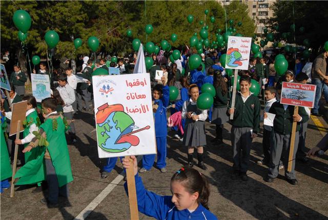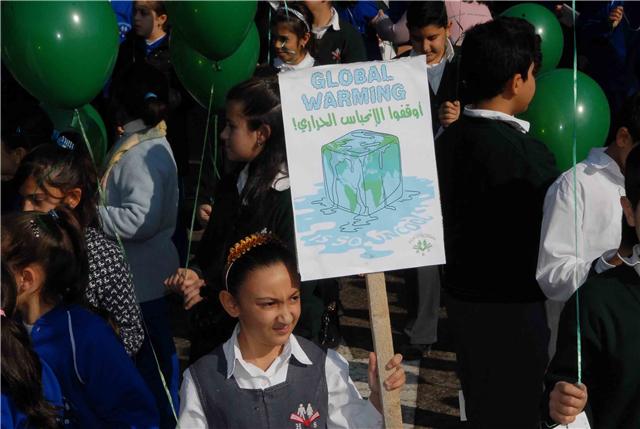 ووسط شجيرات الصنوبر الخضراء التي تملأ مستديرة السراي الحكومي ، رفع التلامذة المشاركون لافتات تدعو الى حماية الأرض والحد من الاحتباس الحراري ودعوة بلغتهم الخاصة الى المؤتمرين في كوبنهاغن لأن يوقفوا الخطر الذي يتهدد كوكبهم. ومن اللافتات التي رفعت: "طيرنا صرخة بالجو / لازم نحمي كوكبنا .. ما رح تنفع كلمة لو / اذا ما سمعتو مطلبنا".
