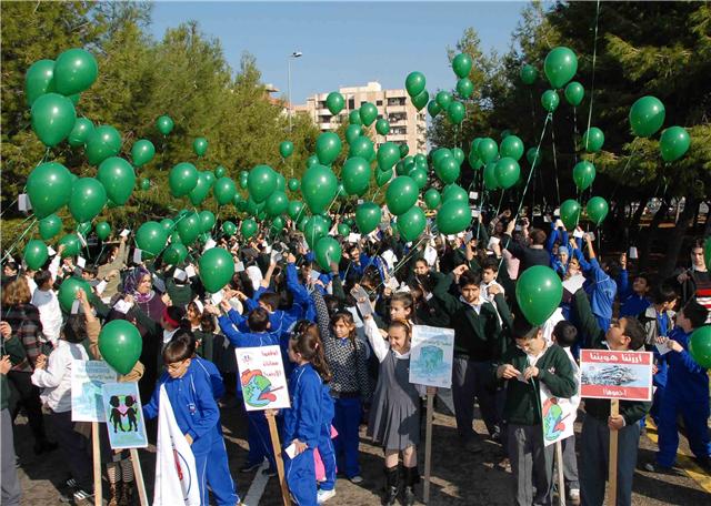 ففي اعتصام بيئي دعا اليه تلامذة مدرسة الحاج بهاء الدين الحريري في حديقة مستديرة سرايا صيدا الحكومي لمناسبة يوم الشجرة وانعقاد مؤتمر كوبنهاغن البيئية ، وجه مائة واثنان تسعون طالبا وطالبة بعدد دول العالم المشاركة في المؤتمر ، صرخة على شكل رسالة طائرة بواسطة بالون أخضر تتضمن دعوة اليهم بأن أوقفوا معاناة الأرض .. أوقفوا الاحتباس الحراري لتحفظوا الحياة والانسان على هذه الأرض. ومن بين الرسائلة الموجهة ايضاً معلومات أعدها الطلاب ضمن درس تطبيقي كل حول الشجرة التي يحبها أو يختارها ، ودعوة الى من سيتسلم الرسالة بـ"أن حافظوا على هذه الشجرة لتحفظوا الحياة والانسان على هذه الأرض". وتقدم البالونات الـ192 بالون كبير يرمز الى الأرض النقية كما يتمناها ويحلم بها الأطفال . وربطت به رسالة جاء فيها : نحن أولاد الأرض .. من صيدا ، من جنوب لبنان ، من قلوب الأطفال نداء : أيها الكبار ارحموا كوكبنا الصغير ، أشجارنا تموت .. وجودنا يزول .. فلا تحرموا أطفالنا الحياة .