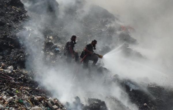 صور إهماد الحريق الكبير في جبل النفايات من خلال طوافة