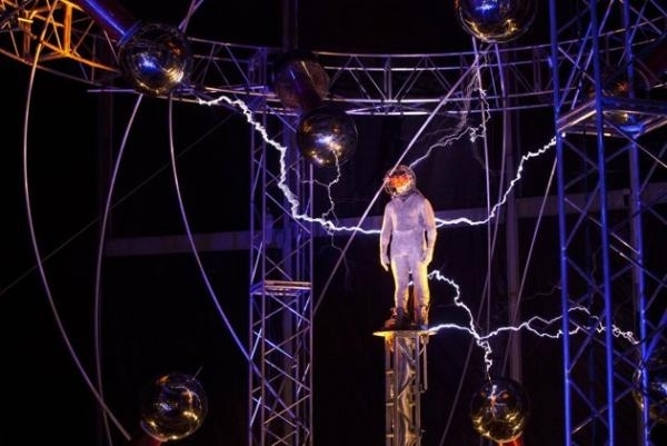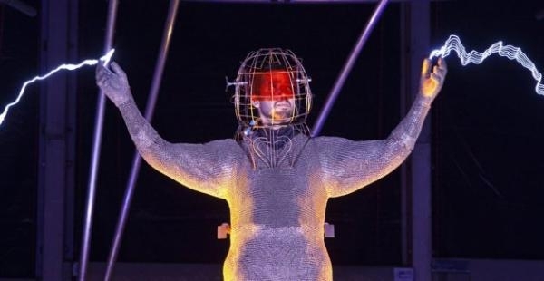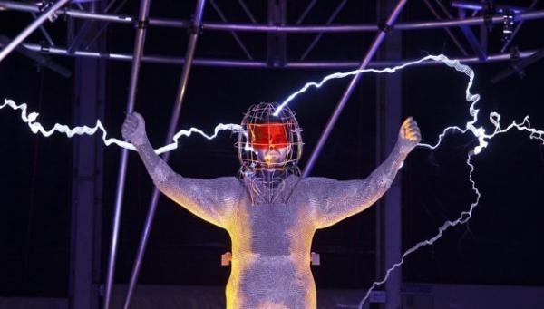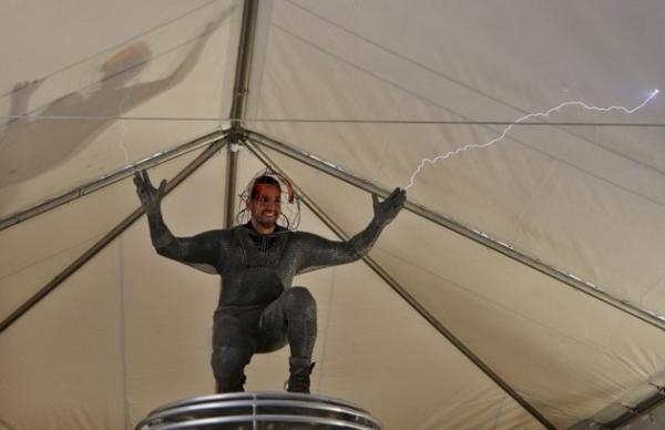 يقدم استعراضي أمريكي على تجربة مثيرة في مدينة نيويورك بارتداء سترة من المعدن وتوصيلها بتيار كهربائي تبلغ طاقته مليون فولت