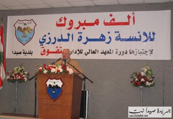 كرمت بلدية صيدا رئيسة الدائرة المالية في البلدية الآنسة زهرة الدرزي بمناسبة تفوقها ونيلها المراتب الأولى بدرجة مميزة في الدورة التدريبية لموظفي الفئة الثالثة للإداريين في الإدارات العامة والبلديات .