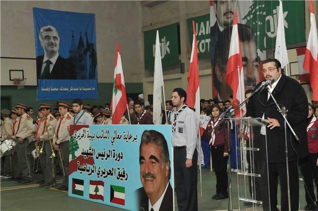 ثم تحدث ممثل راعية الاحتفال النائب بهية الحريري نجلها احمد الحريري فنقل تحياتها الى الحاضرين وتمنياتها بنجاح الدورة ، التي رأى أنها تعبر عن الوفاء للرئيس الشهيد رفيق الحريري الذي احب الرياضة وسعى جاهداً في حياته من اجل تطوير الرياضة اللبنانية وتكوين جيل من الرياضيين يفخر بهم لبنان الوطن. وقال: خمس سنوات مرت على اغتيال الرئيس الشهيد رفيق الحريري ، شهيد الفقراء والكادحين شهيد الوطن والامة العربية وخاصة القضية الفلسطينية. ولكن الحزن على فراقه ما زال ساكناً في نفوس احبائه ومريديه وفي نفوس المدافعين عن مشروعه الوطني لبناء لبنان العربي الحديث، لبنان دولة المؤسسات، لبنان العدالة الاجتماعية والانماء المتوازن، لبنان الرسالة والعيش المشترك. وهذا الحزن لم يكن يعني ابداً لجماهير رفيق الحريري الاستسلام امام مشروع المجرمين القتلة الذين خططوا ونفذوا واغتالوا الرئيس الشهيد انما هذا الحزن كان وما زال المُفَجِّرْ لإرادة الشعب اللبناني، هذا الشعب الذي كسر قيود الخوف المفروضة عليه عنوة من قوى الامر الواقع والذي جابه متسلحاً بوفائه لرفيق الحريري كل المؤامرات العربية والاقليمية لمنع لبنان ولوج الاستقلال الحقيقي الذي هو مفتاح الازدهار الاقتصادي والعلمي والتنموي.