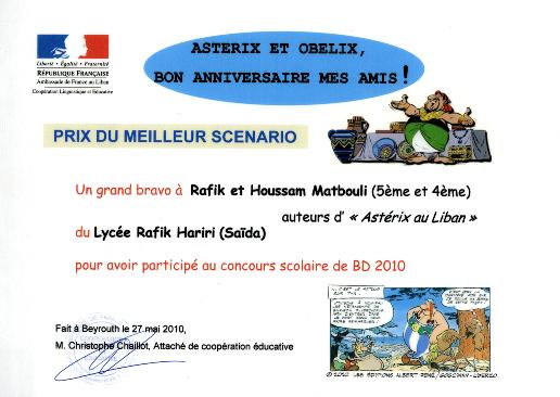 وقد حاز السيناريو الذي كتبه الشقيقان رفيق وحسام ( وهما نجلا الدكتور مصطفى متبولي مدير كلية الاعلام والتوثيق في الجامعة اللبنانية –الفرع الأول) جائزة لجنة التحكيم كأفضل سيناريو باللغة الفرنسية للشريط المصور الذي يروي زيارة "Astérix " الى لبنان.