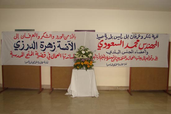 تحية شكر وعرفان للمهندس محمد السعودي رئيس بلدية صيدا وباقة من الشكر والورود للآنسة زهرة الدرزي أمين عام البلدية، من عمال بلدية صيدا، وذلك لمساندتهم العمال في مشكلة المنح المدرسية. وهذا الأسلوب الجديد والمودة بين عمال البلدية ورئيسها وأمينها العام، لم تشهده البلدية منذ سنين، وهذا يدل على الشراكة في العمل الإداري والتنفيذي وسياسة جديدة يتبعها المهندس السعودي مع الموظفين خاصة تعاطيه مع مشكلة قطع الرواتب القصري عنهم.