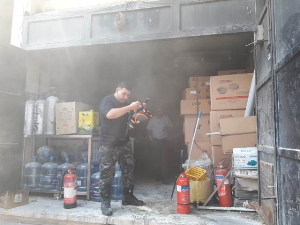 عمل رجال سرية اطفاء مدينة صيدا على اخماد الحريق في مستودع كنتاكي عبرا