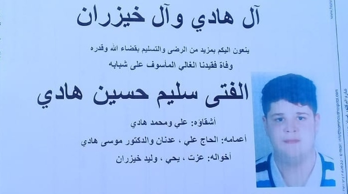 توفي الفتى سليم حسين هادي (17 عاما) فجر اليوم متأثرا بجراحه جراء الرصاصة الطائشة التي اصاب٩ته في رأسه يوم السبت الماضي في حارة صيدا، وذلك أثناء اطلاق النار في الهواء في حفل زفاف داخل مخيم عين الحلوة.