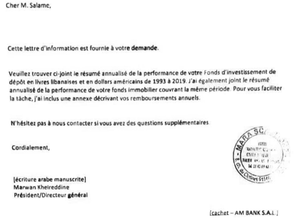 واشارت المصادر عينها الى ان خير الدين معني بأكثر من جانب يبحث عنه المحققون، لكن الأهم هو ذلك الحساب الذي تكاثرت فيه أموال سلامة على نحو "عجيب ومريب، من 15 الى 150 مليون دولار في مدى سنوات، الى ان سحبت تلك الاموال بالكراتين، وفقا لما أكده خير الدين نفسه في تحقيقات سابقة". وعلى رئيس بنك الموارد هذه المرة رواية كامل قصة تلك الاموال المشتبه في انها مبيّضة او مغسولة، والاقلاع عن ادعاء أنها استثمارات بعوائد عالية حققها البنك لرجا سلامة الذي كان يدير الحساب لمصلحة شقيقه رياض.