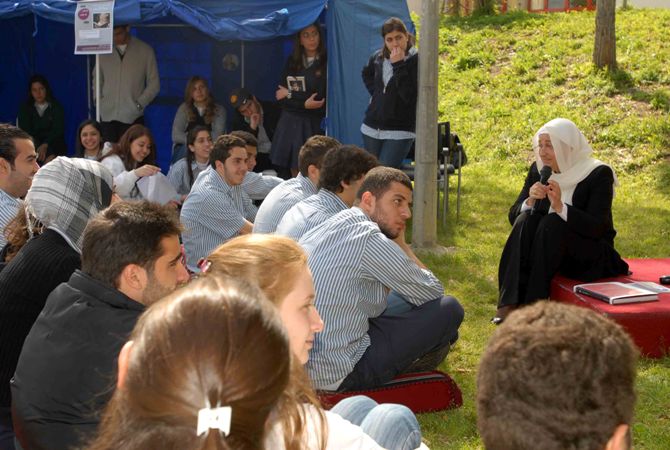 ثم اجابت الحريري على اسئلة الطلاب المتعلقة بعلاقتها بالقراءة والمطالعة واي المواضيع والنصوص التي تحب قراءتها .