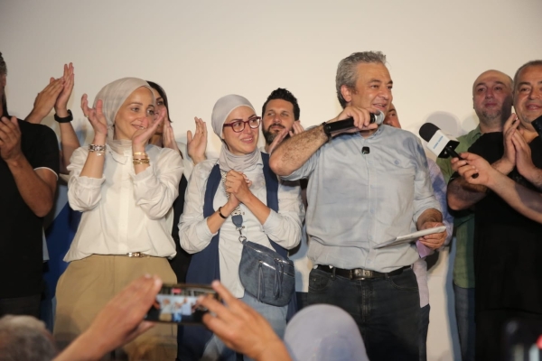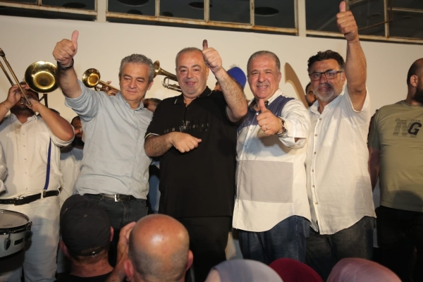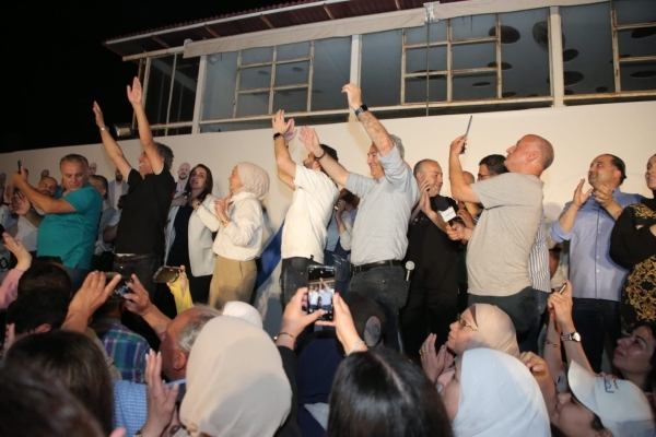 وسط اجواء احتفالية تخللها اطلاق مفرقعات وأسهم نارية، وعلى وقع عزف الموسيقى والأغاني الخاصة بالمناسبة ، توجه رئيس اللائحة المهندس مصطفى حجازي والمرشح لمنصب نائب الرئيس الدكتور أحمد عكره واعضاء اللائحة (الفائزون والذين لم يحالفهم الحظ) بالتحية الى الجماهير المحتشدة .