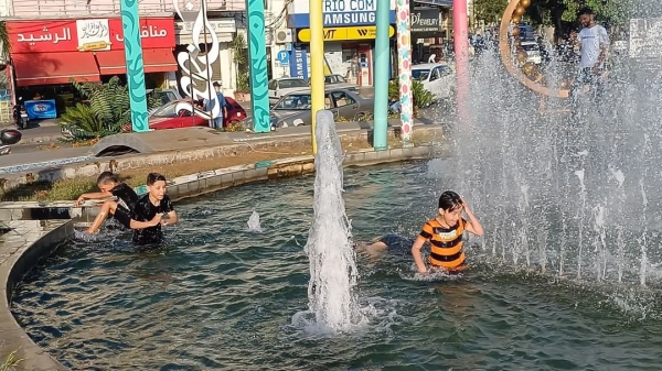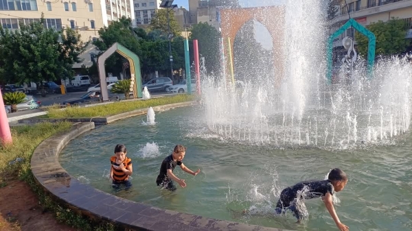 عدد من الأطفال على السباحة في النافورة العامة وسط درجات حرارة