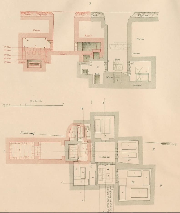 وبهدف استكشاف البئر بشكل تام، قامت السلطات بارسال بشارة أفندي كبير مهندسي الولاية في ذلك الوقت، الذي وجد بدوره ان قعر البئر عبارة عن غرفة صغيرة خالية (vestibule) تتوسّط غرفاً سبعة تحوي مجتمعةً سبعة عشر تابوتاً حجريّاً تنافس بعضها بعضا في الجمال والروعة. وهكذا بات من المؤكد أن أرض محمد الشريف تحوي في باطنها مقبرةً ملكيّة قل نظيرها!