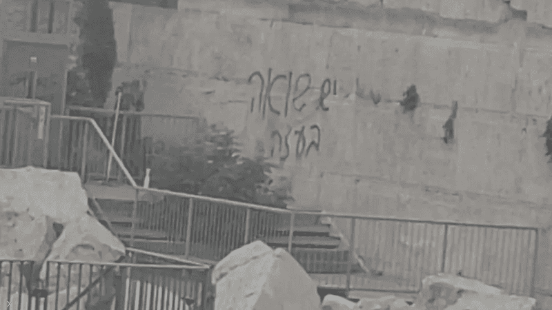 ونشرت الشرطة الإسرائيلية الإثنين صورة للعبارة التي كُتبت باللون الأسود بالعبرية على الجزء الجنوبي من الحائط الغربي وفق التسمية اليهودية.