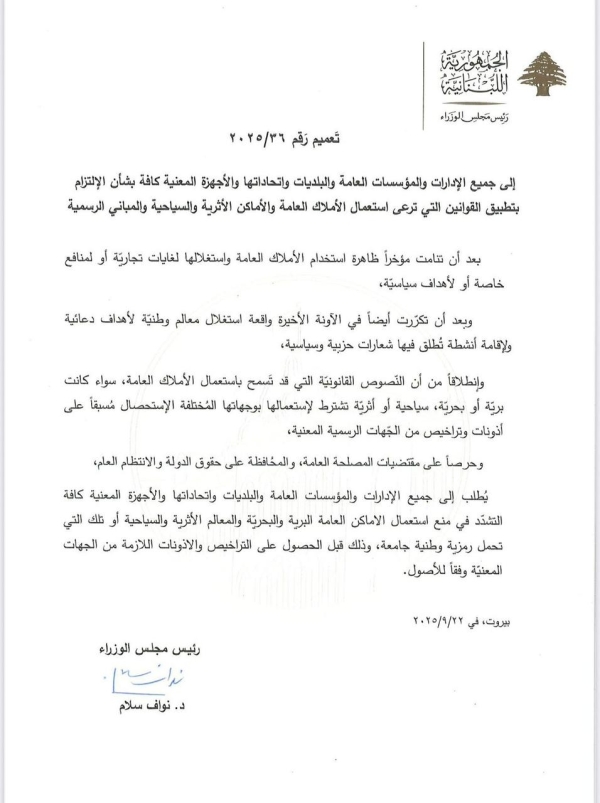 أصدر رئيس الحكومة نواف سلام تعميماً إلى جميع الإدارات والمؤسسات العامة والبلديات واتحاداتها والأجهزة المعنية كافة بشأن الالتزام بتطبيق القوانين التي ترعى استعمال الأملاك العامة البرية والبحرية والأماكن الأثرية والسياحية والمباني الرسمية والمعالم التي تحمل رمزية وطنية جامعة.
