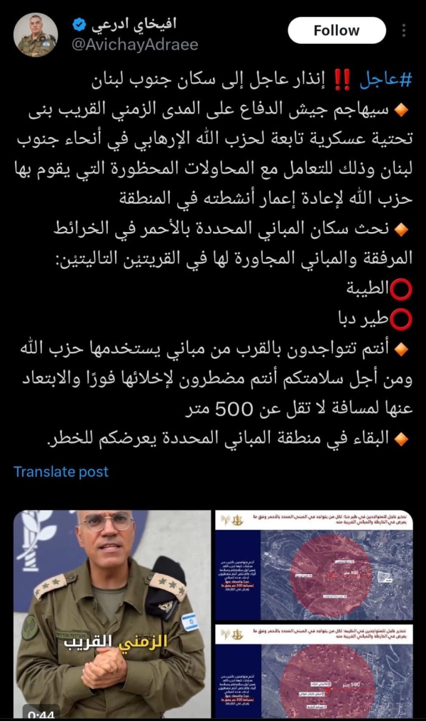 التهديد الجيش الإسرائيلي بقصف في بلدةطيردبا و الطيبه