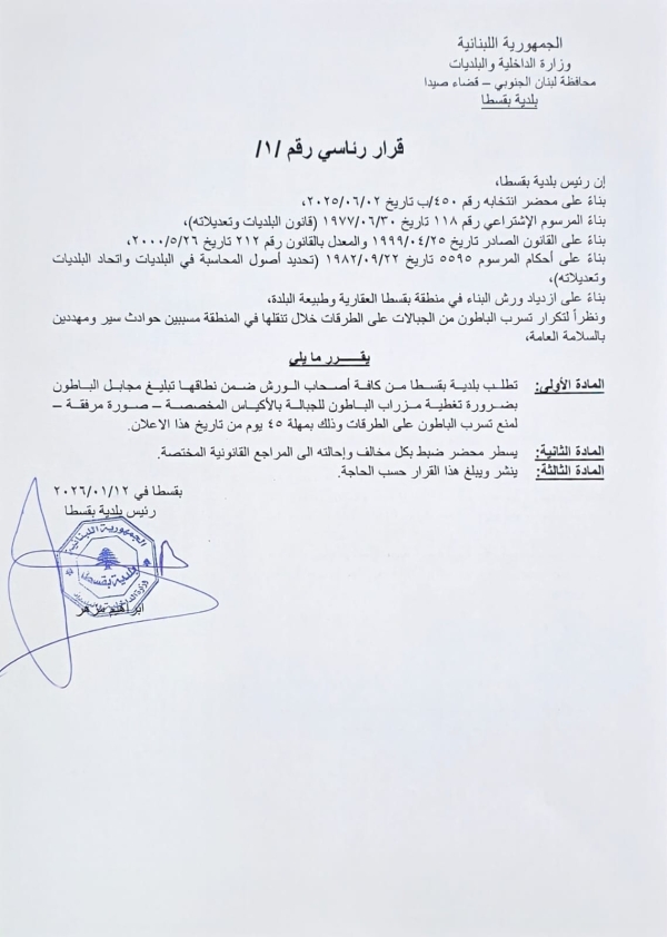 بناءً على إزدياد ورش البناء في منطقة بقسطا العقارية وطبيعة البلدة، ونظراً لتكرار تسرب الباطون من الجبالات على الطرقات خلال تنقلها في المنطقة مسببين حوادث سير ومهددين بالسلامة العامة،