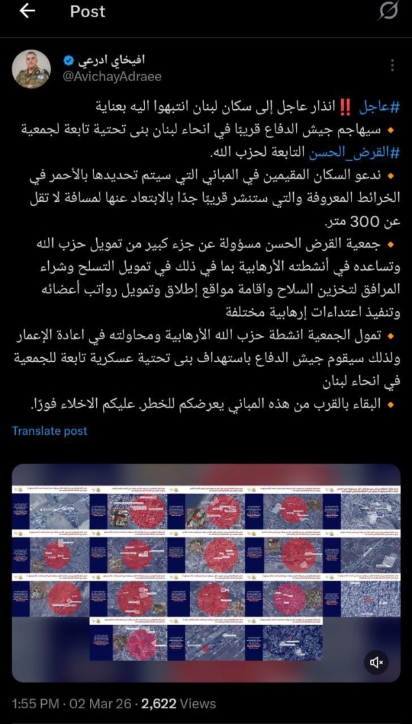 سيهاجم جيش الدفاع قريبًا في انحاء لبنان بنى تحتية تابعة لجمعية القرض_الحسن التابعة لحزب