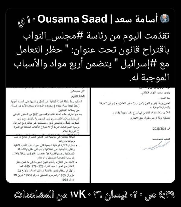 لقد قدّم للتو مشروع قانون يحظر أي اتصال مع إسرائيل، واعتبر ذلك خيانة عظمى، بينما يتجاهل الميليشيات التابعة لإيران التي تدمّر لبنان.