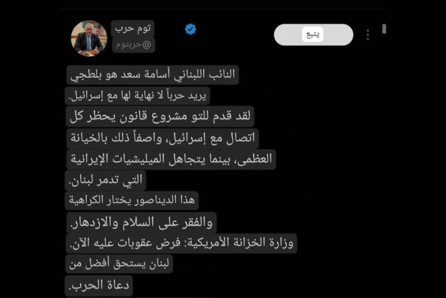 توم حرب: النائب اللبناني أسامة سعد “بلطجي” يسعى لحربٍ مفتوحة مع إسرائيل… ويطالب وزارة الخزانة الأميركية بفرض عقوبات عليه