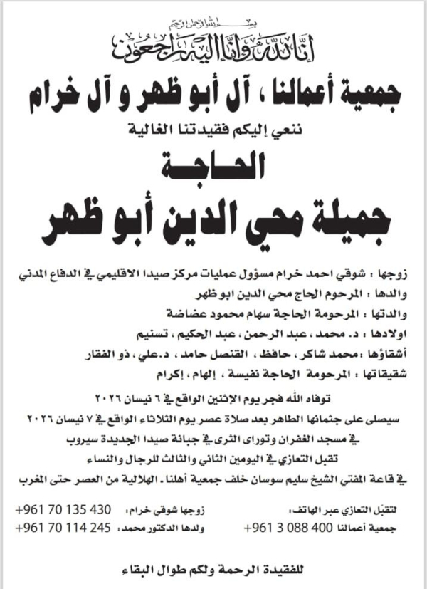 جمعية أعمالنا ، آل أبو ظهر و آل خرام ننعي إليكم فقيدتنا الغالية الحاجة جميلة محي الدين أبو ظهر