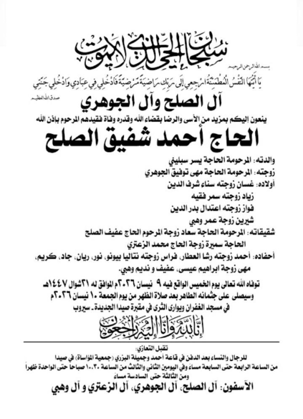 تقبّل التعازي بوفاة المحامي المرحوم عبد الرسول عاصي
