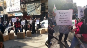 النسوة قمن بقطع طريق سوق الجمال التجاري في منطقة الشياح وذلك رفضا للعمالة السورية.