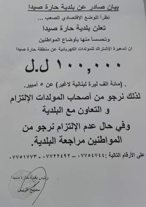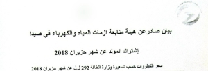 جداول تسعيرة المولدات بالتفصيل عن شهر حزيران من هيئة متابعة أزمات الكهرباء والمياه في صيدا