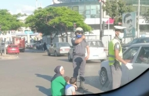 افترشت سيدة مع طفليها الصغيرين، الطريق عند تقاطع اشارة ايليا - صيدا