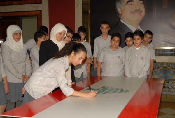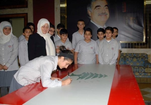 ودونت الحريري أول توقيع على علم لبناني كبير ايذانا بانطلاق حملة التواقيع التي ستعم كافة المدارس ، كما وقع التلامذة المشاركون العلم نفسه سيرا على خطى رجالات الاستقلال الذين وقعوا العلم الأول، والقت الحريري كلمة بالمناسبة خاطبت فيها الطلاب بالقول : بقدر ما استطعتم احلموا ، كلما حلمتم كلما كان لبنان بخير، فلا شيء يجب أن يقف بوجه احلامكم وطموحاتكم ونحن سنسهل لكم الطريق لتحققوا ما تحلمون به لكن بالدرجة الأولى الأمن والاستقرار.. العلم اللبناني يجمعنا ، ويجب أن تعرفوا ان هذا العلم عندما أُقرّ،وقع عليه رجالات تاريخيون ، والآن انتم تسيرون على خطى هؤلاء الرجالات لتقولوا اننا لا زلنا مؤمنين بهذه الصيغة اللبنانية التي هي التعددية والسلم الأهلي والعيش المشترك .. لبنان يتسع لنا جميعا .. وليس كثيرا على صيدا ان يكون انطلاق هذه الحملة منها لأن اول رئيس حكومة بهذه الصيغة كان من صيدا هو دولة الرئيس رياض الصلح .. فحافظوا على العلم واحملوه الى بيوتكم وارفعوه على الشرفات واحتفظوا به .. لأنه رمز كلما حافظنا عليه كلما حافظنا على كرامتنا ..