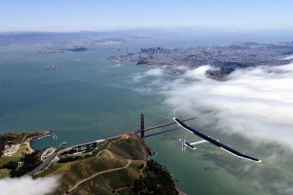 حلقت طائرة تعمل بالطاقة الشمسية فوق منطقة خليج سان فرانسيسكو في رحلة تجريبية قبل أن تعبر فوق الولايات المتحدة في مطلع أيار.