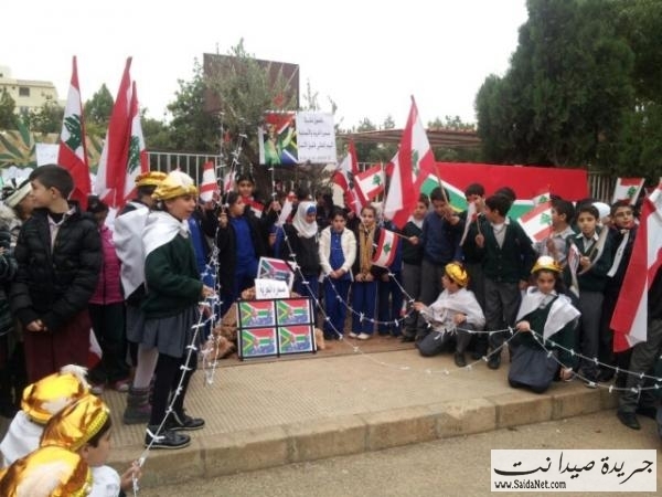 وألقى منسق عام الشبكة المدرسية لصيدا والجوار نبيل بواب كلمة بالمناسيبة فقال : اليوم 10 كانون الاول 2013 هي صرخة للمطالبة بحقوق الانسان في كل انحاء العالم واليوم نقف وقفة تحية اعتزاز وفخر لروح الرئيس نيلسون مانديلا الذي كان اول من طالب بحقوق الانسان ووقف وقفة اعتزاز ضد التمييز العنصري ونحن اليوم بهذه الوقفة نقول من صيدا عاصمة الجنوب اننا مع حقوق الانسان ومع حقوق كل الشعوب المضطهدة لا سيما حقوق الشعب الفلسطيني وارتدى الطلاب الابيض ليقولوا اننا مع السلام ومع التسامح مع الحرية .