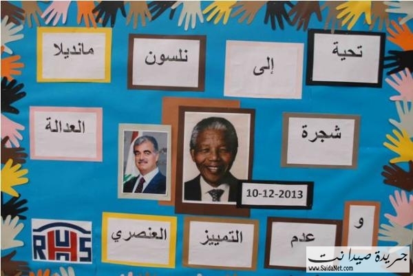 في مدرسة الحاج بهاء الدين الحريري شكل تلامذة مدارس عائشة ام المؤمنين ودوحة المقاصد والاصلاح الرسمية بالاضافة الى البهاء لوحة تعبيرية تحية لمانديلا الذي ناضل من اجل حقوق الانسان . ومن ثم وقفوا دقيقة صمت ونكسوا الاعلام اللبنانية حدادا ، وجرى اطلاق اسمه على شجرة زيتون معمرة في باحة المدرسة لتكون شجرة الحرية والانسانية وزينوها بالشارات البيضاء رمزا للسلام وبصور مانديلا وعلم بلاده .وذلك بمشاركة مديرة المدرسة وداد النادري وممثلين عن ادارات المدارس المشاركة.