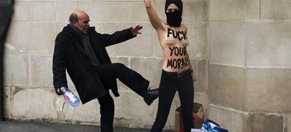 4- فرنسا، رجل يركل ناشطة Femen عارية الصدر خلال احتجاجها قرب جامع في باريس.