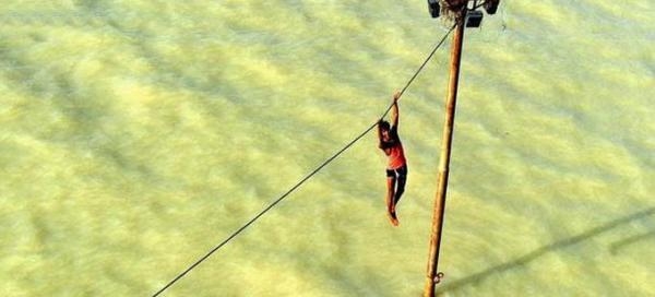 3- الهند، رجل معلّق على حبل الكهرباء هربا من الفياضان.