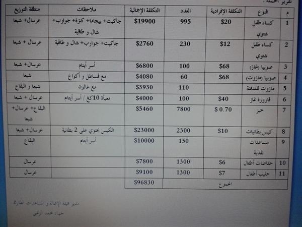 وأرفقت الهيئة في بيانها صورا مختارة عن فعاليات الحملة وقوافلها الإغاثية التي تم إيفادها إلى كل من البقاع والعرقوب وعرسال ، كما وأرفقت نشرة تفصيلية عن نوع الإغاثة التي قدمتها الحملة وتكلفتها الإفرادية وعدد المستفيدين ومناطق التوزيع – الصورة أدناه - .