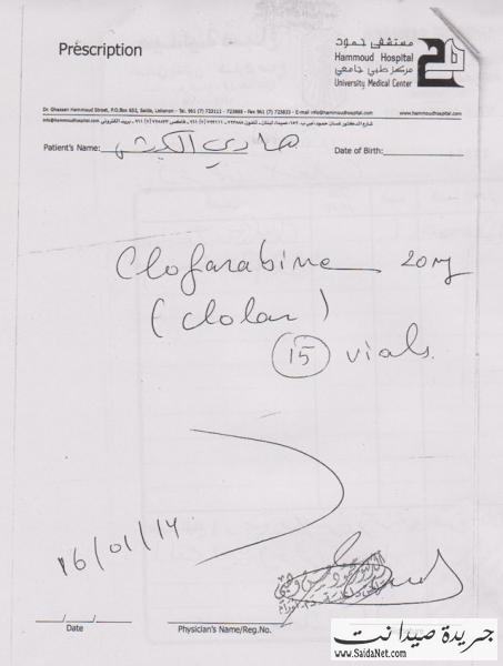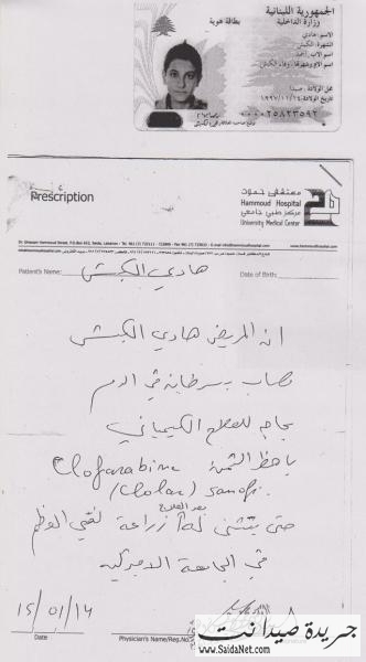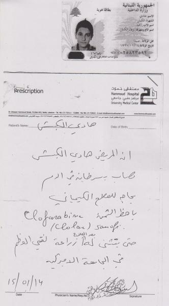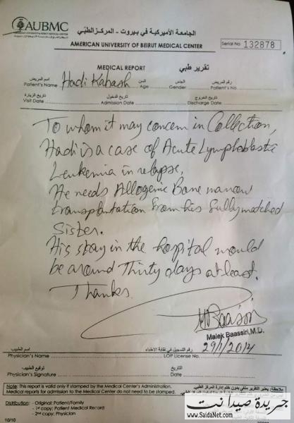 الرجاء من أهل الخير والمعروف النظر في حالة الفتى هادي الكبش من خلال التقارير المرفقة، خاصة أنه بحاجة إلى 15 جلسة علاج كيميائي في المرحلة الأولى تؤهله لزراعة نقي العظم في الجامعة الأميركية.