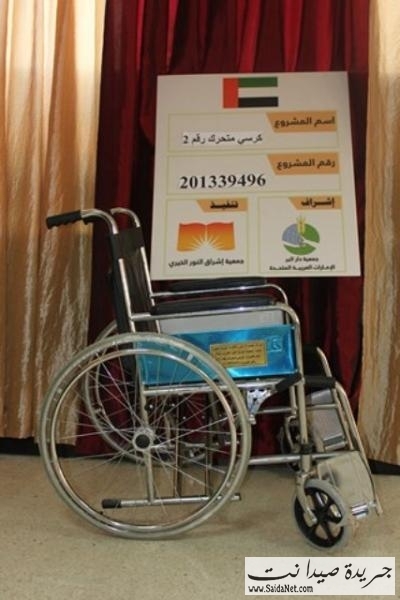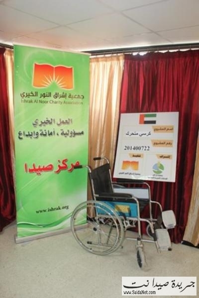 قامت إدارة المشاريع في جمعية إشراق النور الخيري بتوزيع أربع كراسي متحركة، في مركز صيدا، على أربع مرضى من ذوي الإحتياجات الخاصة، تقدمة من جمعية دار البرفي الإمارات العربية المتحدة.