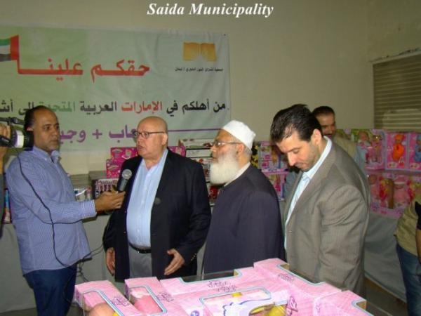 برعاية رئيس بلدية صيدا المهندس محمد السعودي، إفتتحت جمعية إشراق النور الخيري في صيدا وجمعية دار البر الخيري في الإمارات العربية المتحدة معرض التسوق الإغاثي الخيري للمساعدات المقدمة من دولة الإمارات لعائلات الأطفال الأيتام من النازحين السوريين إلى منطقة صيدا.