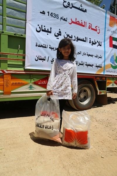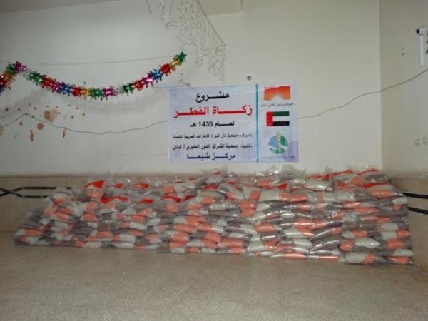 ففي البقاع تم توزيع صدقات الفطر _ 10 كيلو من الحبوب المختلفة_ على 300 أسرة من أسر النازحين السوريين في: مخيم السندباد- تعلبايا، مخيم الابرار- برالياس ، مخيم الفيضة ،وتجمعات سكنية في مجدل عنجر، وقد بلغت التكلفة الإجمالية للتوزيع 6300000 ل.ل. بالتعاون مع جمعية دار البر في الإمارات العربية المتحدة، ومخرجي الزكاة.