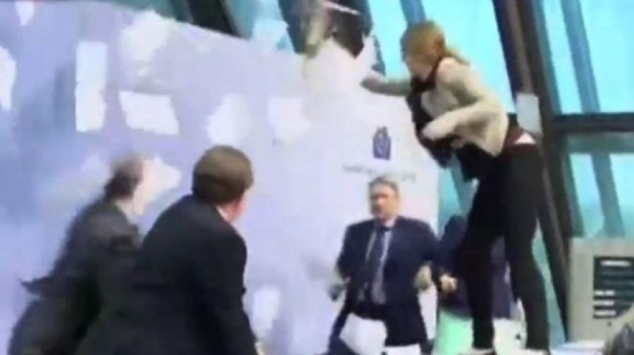 بالصور فتاة تقتحم مؤتمر رئيس المركزي الأوروبي