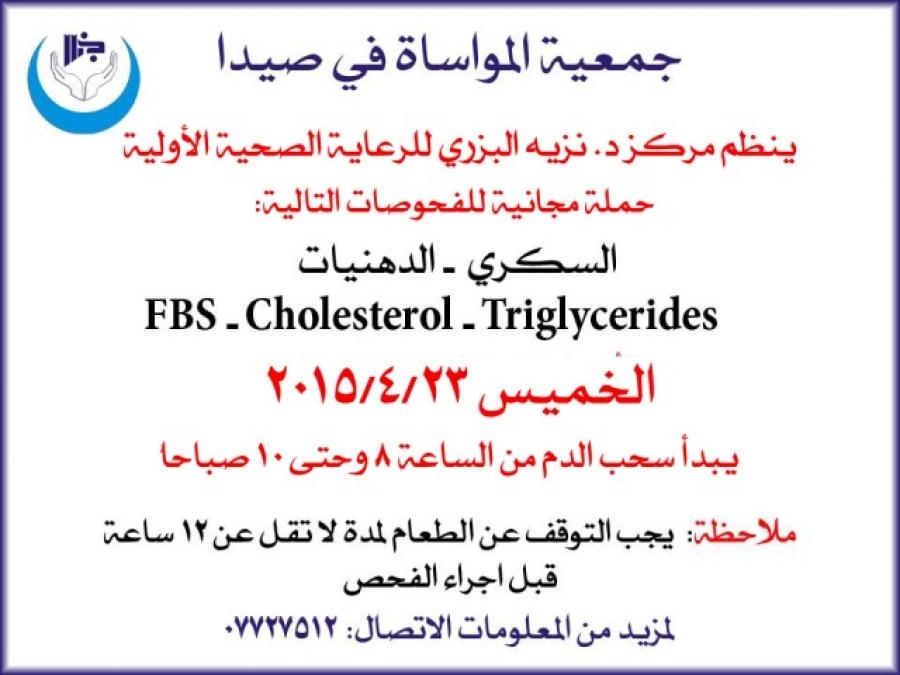 حفاظاً على سلامة المواطن اللبناني . ينظم مركز د . نزيه البزري يوم الخميس - 23/4/2015 - حملة مجانية للفحوصات: السكري ، والدهنيات.