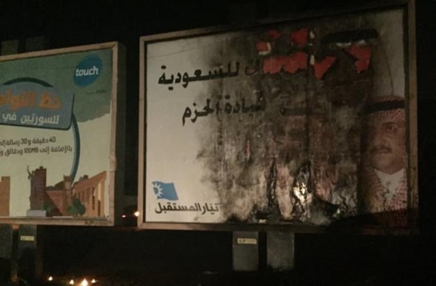 في حادثة هي الثانية من نوعها في غضون اسبوع اقدم مجهولون على احراق لافتتين رفعهما تيار المستقبل في صيدا تحية للملك السعودي سلمان بن عبد العزيز على الاجراءات الملكية الحازمة التي اتخذها في المملكة ، وكان مسرح الاعتداء هذه المرة محيط ساحة الشهداء في المدينة حيث استهدف لوحتين اعلانيتين تحملان عبارة "مبارك للسعودية قيادة الحزم " والى جانبها صور الملك سلمان وولي عهد وولي ولي العهد .