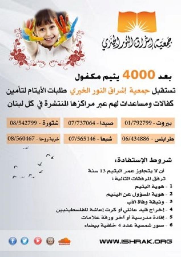 تعلن جمعية اشراق النور عن بدأ استقبال طلبات الايتام لتأمين الكفالات والمساعدات لهم عبر مراكزهم المنتشرة في كل لبنان.