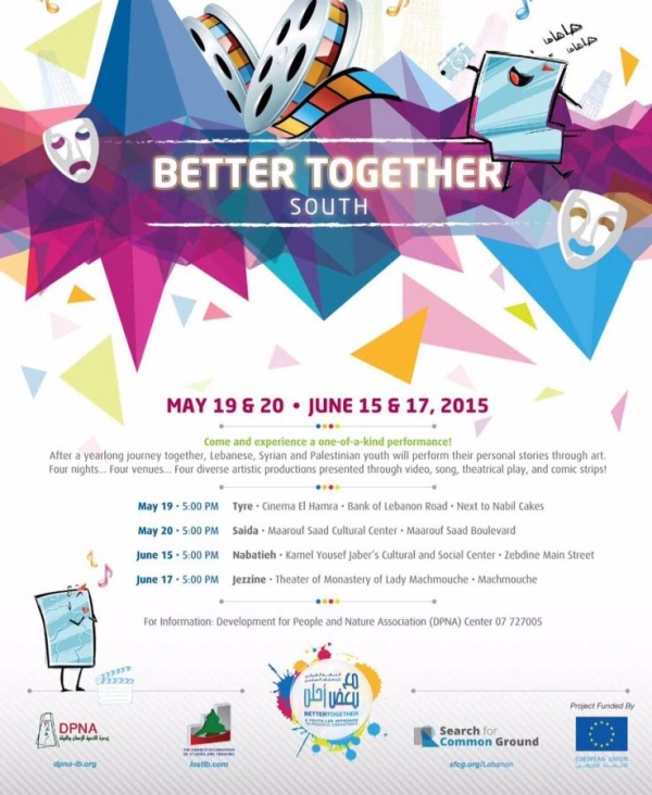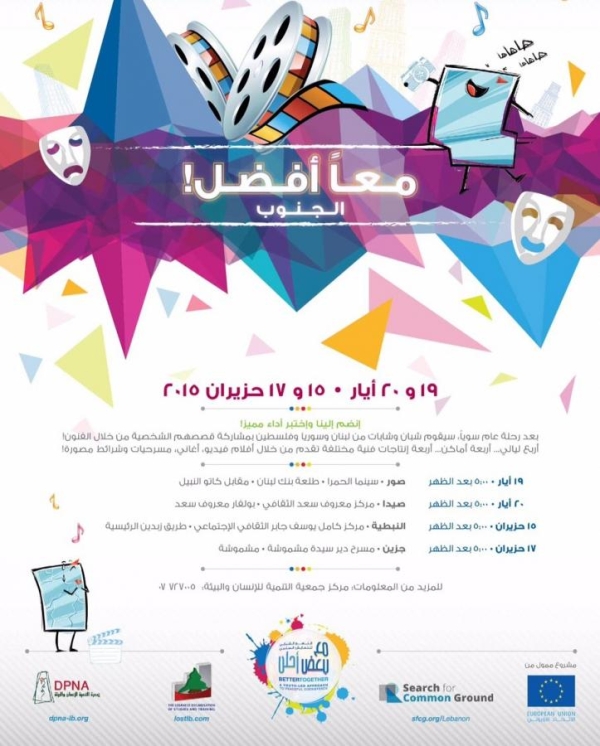 تتشرف جمعية التنمية للإنسان والبيئة DPNA، بالشراكة مع جمعية البحث عن أرضية مشتركة SFCG، بدعوتكم لحضور الحفل الختامي لمشروع “نهج القيادات الشبابية للتعايش السلمي بين اللاجئين السوريين والمجتمعات المضيفة” الذي يهدف الى تطوير العلاقات، الثقة والاحترام بين الشباب اللبناني والسوري والفلسطيني عبر الفنون: فيديو، رسم، مسرح وموسيقى.سيتخلل الحفل عرض مسرحي، فيلم قصير وعرض موسيقي من إنتاج الشباب والشابات المشاركين/ات أنفسهم والفنانين/ات اللبنانيين والسوريين الذي عملوا عليه لمدة ٦ أشهر.