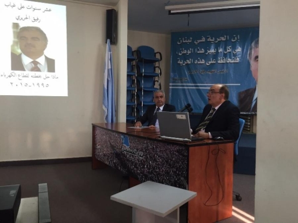 ثم تحدث عكاوي مستحضرا المراحل التي مر بها قطاع الكهرباء في لبنان وقال: عندما اتى الرئيس الشهيد رفيق الحريري وألف اول حكومة كان وضع الكهرباء جدا مهترىء فبدأ بخطة سريعة لتأهيل قطاع الكهرباء ووضع حوالي 600 ميغاوات في غضون ستة اشهر، وفي العام 96 اصبحت التغذية بالكهرباء 24 على 24 وخصوصا في بيروت .. وبعد خطط التأهيل السريعة ، انتقل الرئيس الشهيد الى وضع خطته الكاملة للكهرباء والتي كان يفترض ان تمتد من العام 1996 الى 2015 ، ولكن كما تعلمون بدأت عرقلة تنفيذ الخطة في العام 99 وكلنا نعرف لماذا؟..فخطة رفيق الحريري كان تعتمد على اشراك القطاع الخاص في بناء معامل انتاج لانه يعرف انه كان هناك فساد مستشري في هذا القطاع ، وقانون اشراك القطاع الخاص كان يفترض ان يقر في المجلس النيابي في 1-1 -1998 وتأخر لأسباب سياسية فاقر في سنة 2002 ولكنه لم ينفذ ..خطة رفيق الحريري كانت تقضي بوضع 3600 ميغاوات على الشبكة بنهاية العام 2015 ، منها حوالي 900 ميغاوات انتاج اضافي او احتياط ..