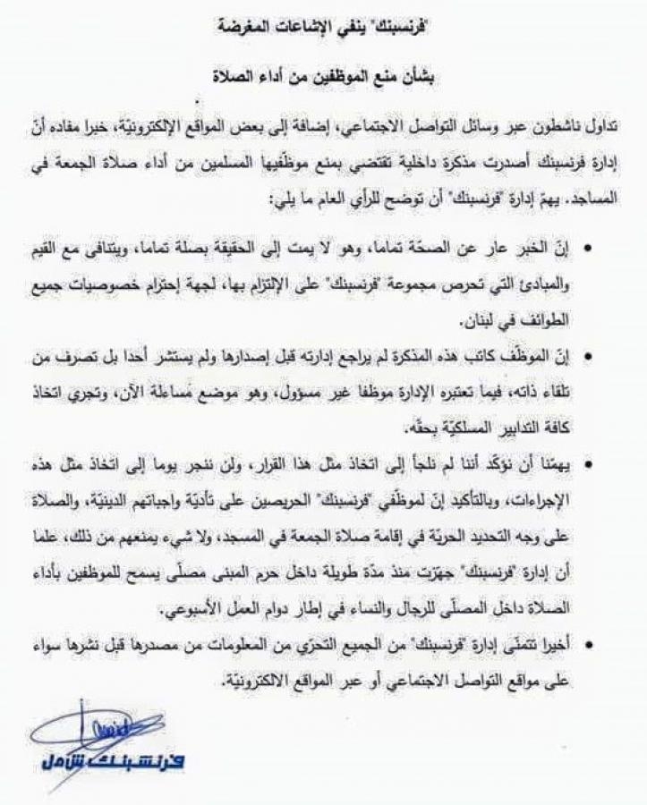 فرنسبنك ينفي الإشاعة المغرضة بشأن منع الموظفين من أداء الصلاة